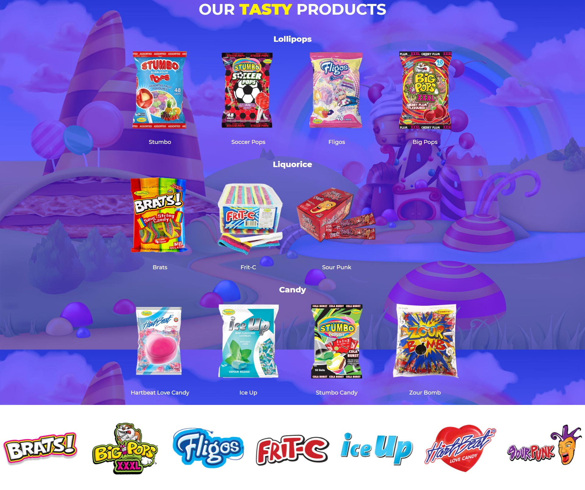 Broadway Sweets also distributes a variety of liquorice candies, including; Brats Sour Strings, Brats Sour Belts, Brats Unicorn and Rainbow Sour liquorice tapes, Frit C Sour Tape, Sour Punk liquorice Candy Sticks. They also have Ice Up lozenges and Hartbeat Love Candy.