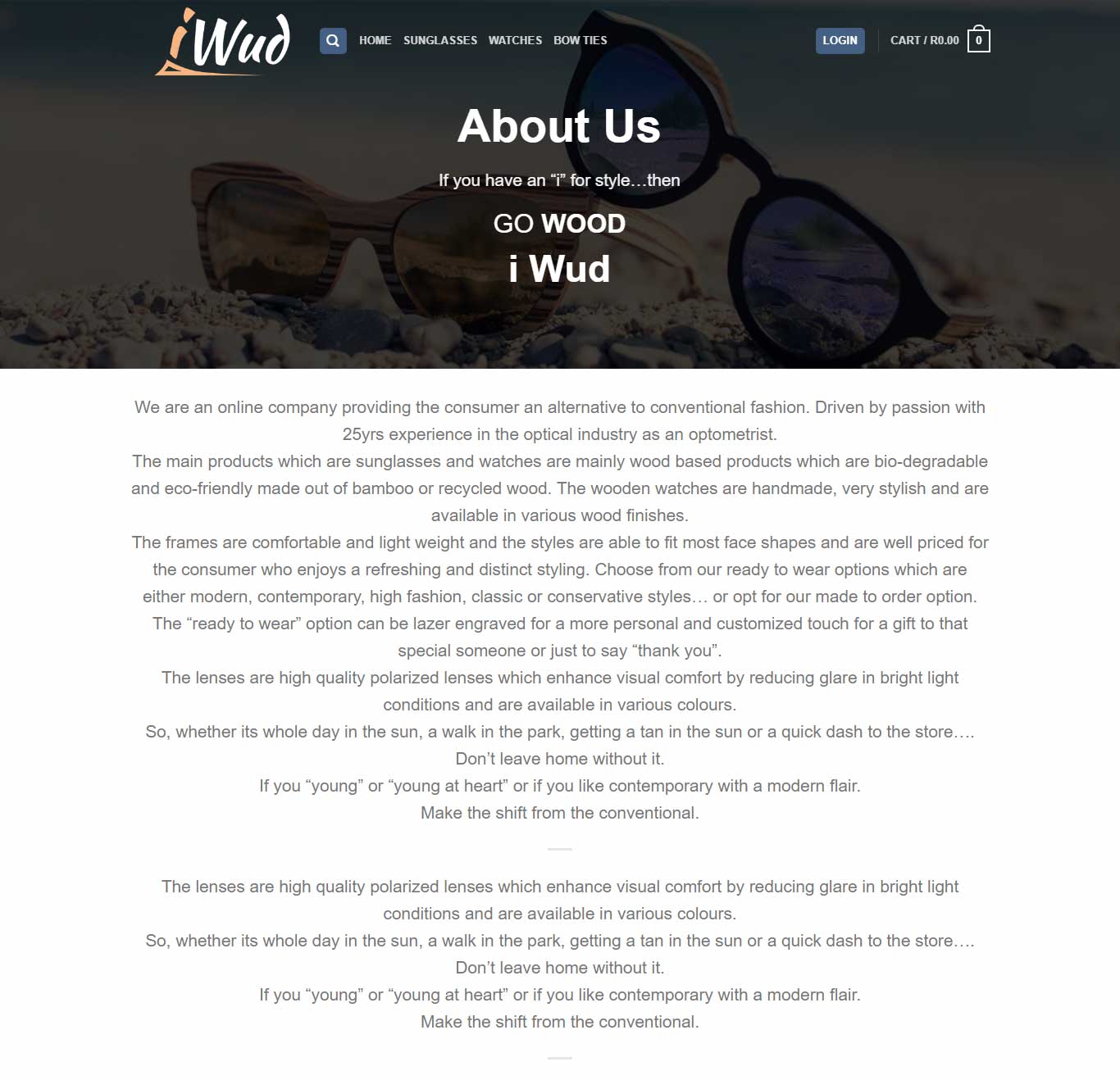 The main products which are sunglasses and watches are mainly wood based products which are bio-degradable and eco-friendly made out of bamboo or recycled wood. The wooden watches are handmade, very stylish and are available in various wood finishes.